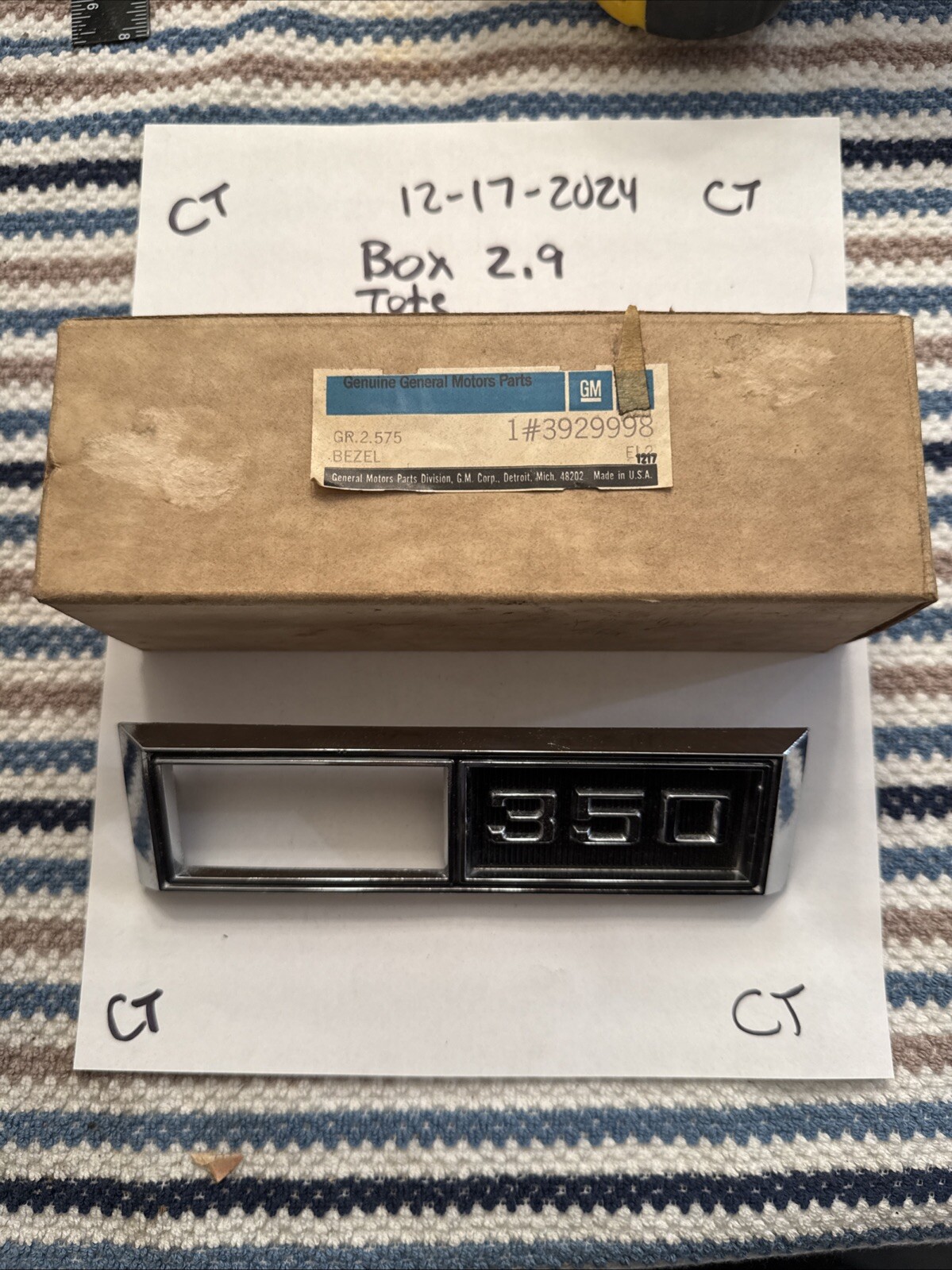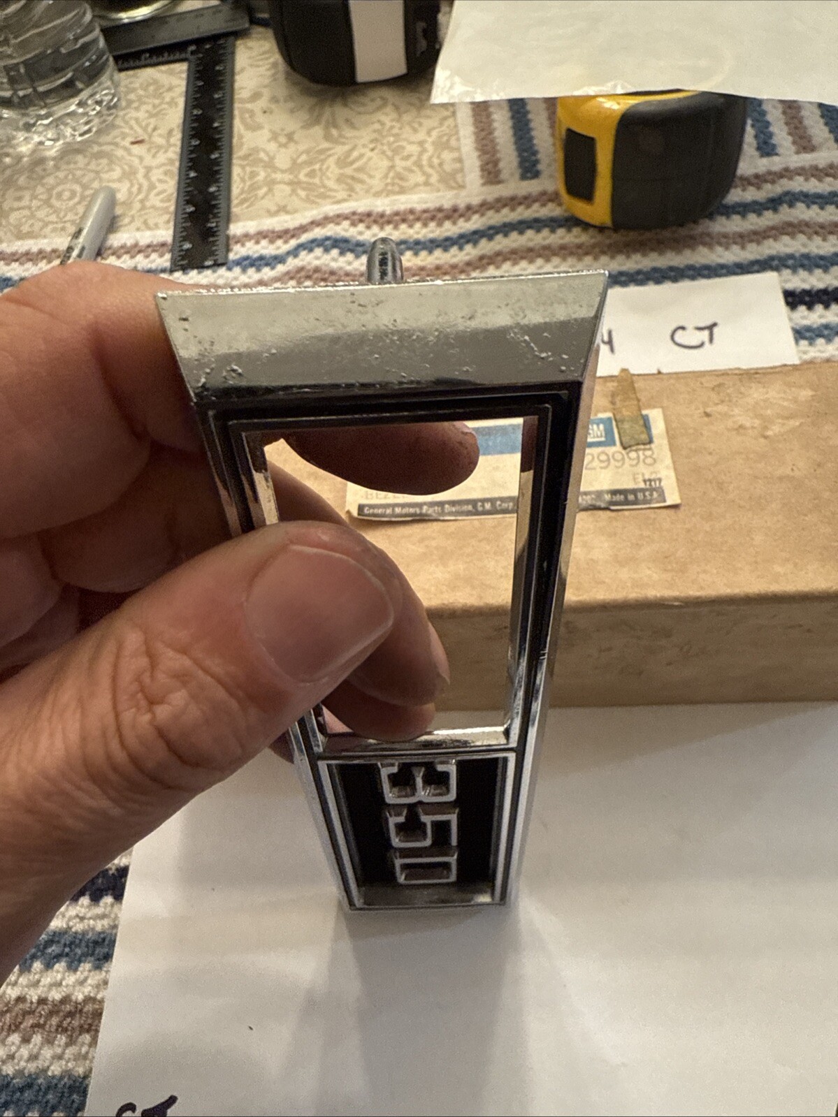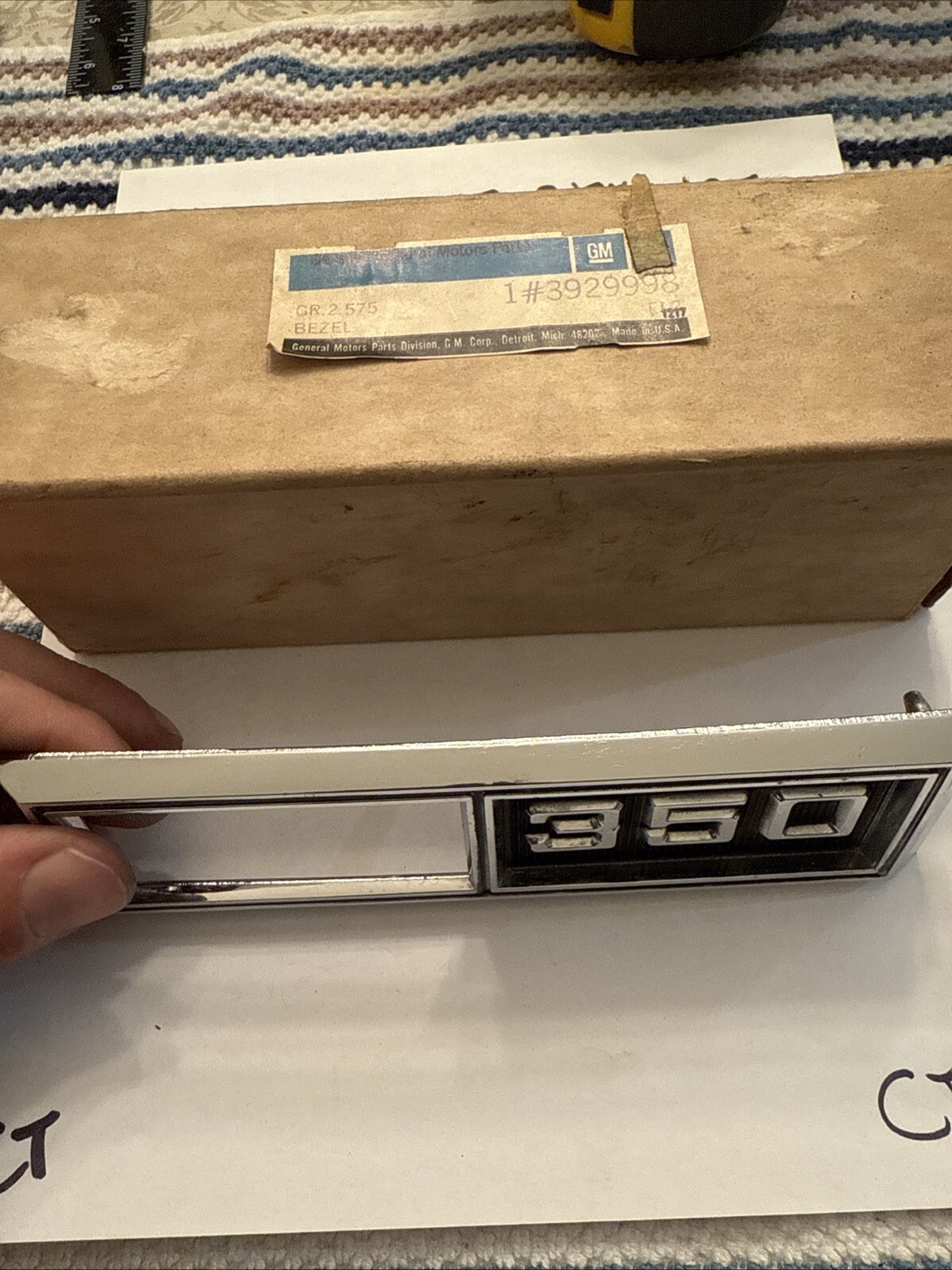 This is an original 1969 Chevrolet Nova 350 RH fender bezel emblem, part number 3929998. It is a genuine OEM GM part that is brand new and has never been used before. This emblem is designed to fit on the fender bezel of a 1969 Nova 350 RH and is made to enhance the appearance of your car.