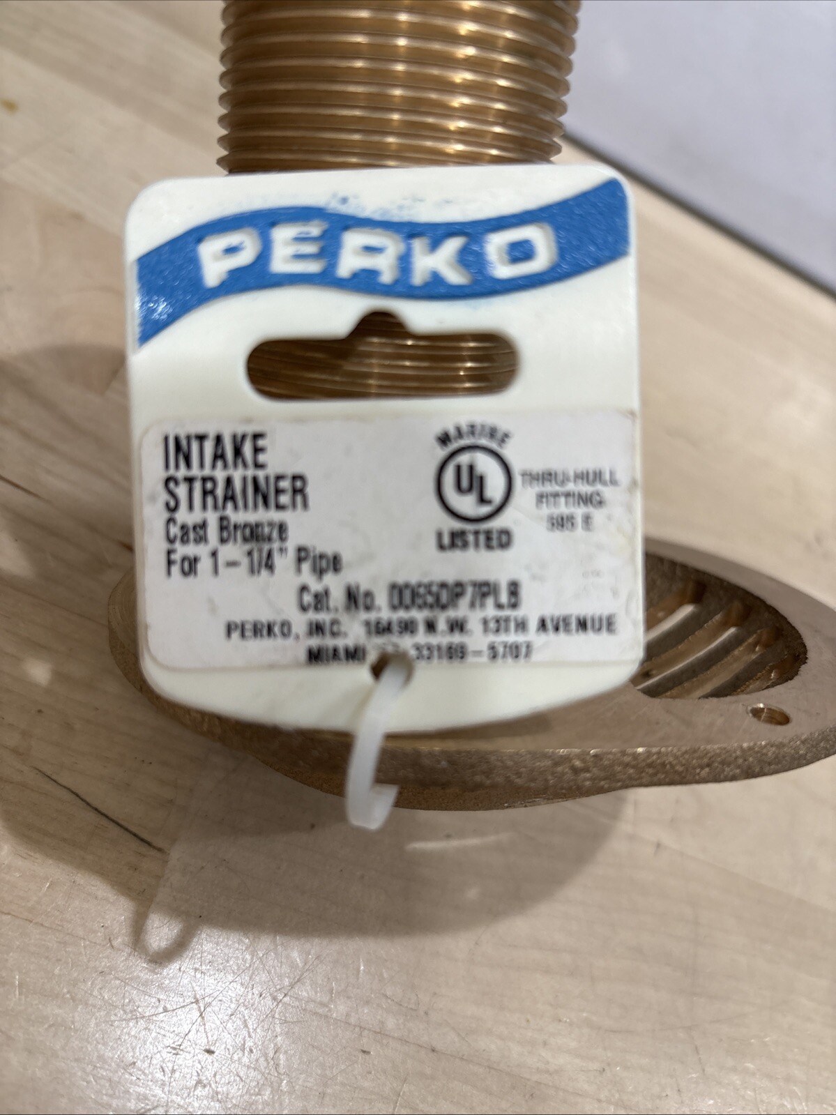The product is a Perko 1-1/4" Intake Strainer made of cast bronze, manufactured by Perko with the part number 0065DP7PLB. This strainer is designed for use in boats and is made in the USA. The strainer is used to prevent debris from clogging the intake system of the boat, ensuring smooth and efficient operation. It is a high-quality product known for its durability and reliability in marine applications.