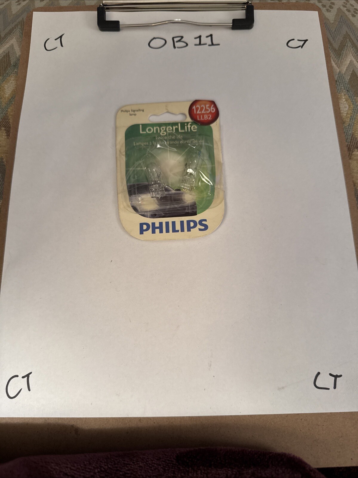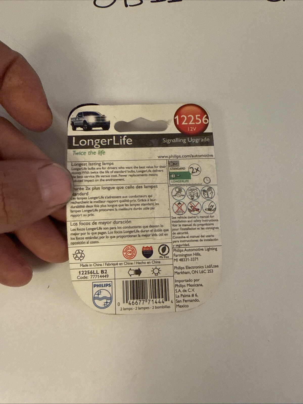 The product is a pack of two Philips 12256 LongerLife miniature bulbs designed for use in vehicles, particularly for front lighting purposes. The bulbs are manufactured in China and are part of Philips' brand line of automotive lighting products. The UPC SKU for easy identification is 046677714444. These bulbs are specifically designed to provide long-lasting illumination for the front of a vehicle, ensuring reliable performance over an extended period of time.
