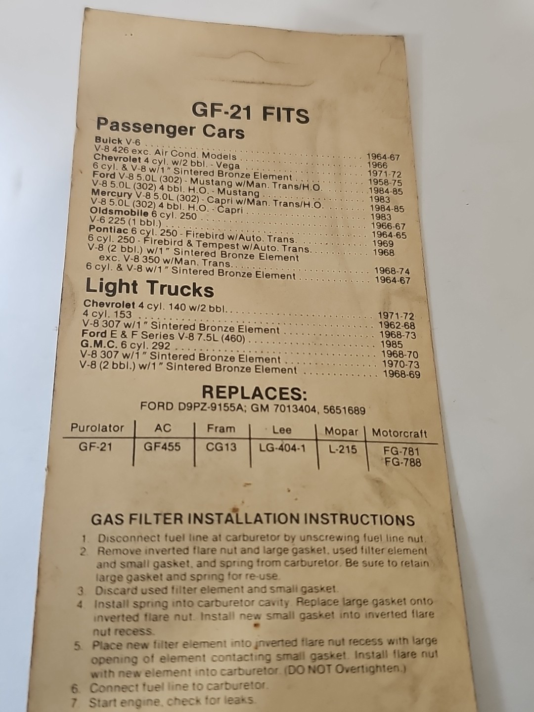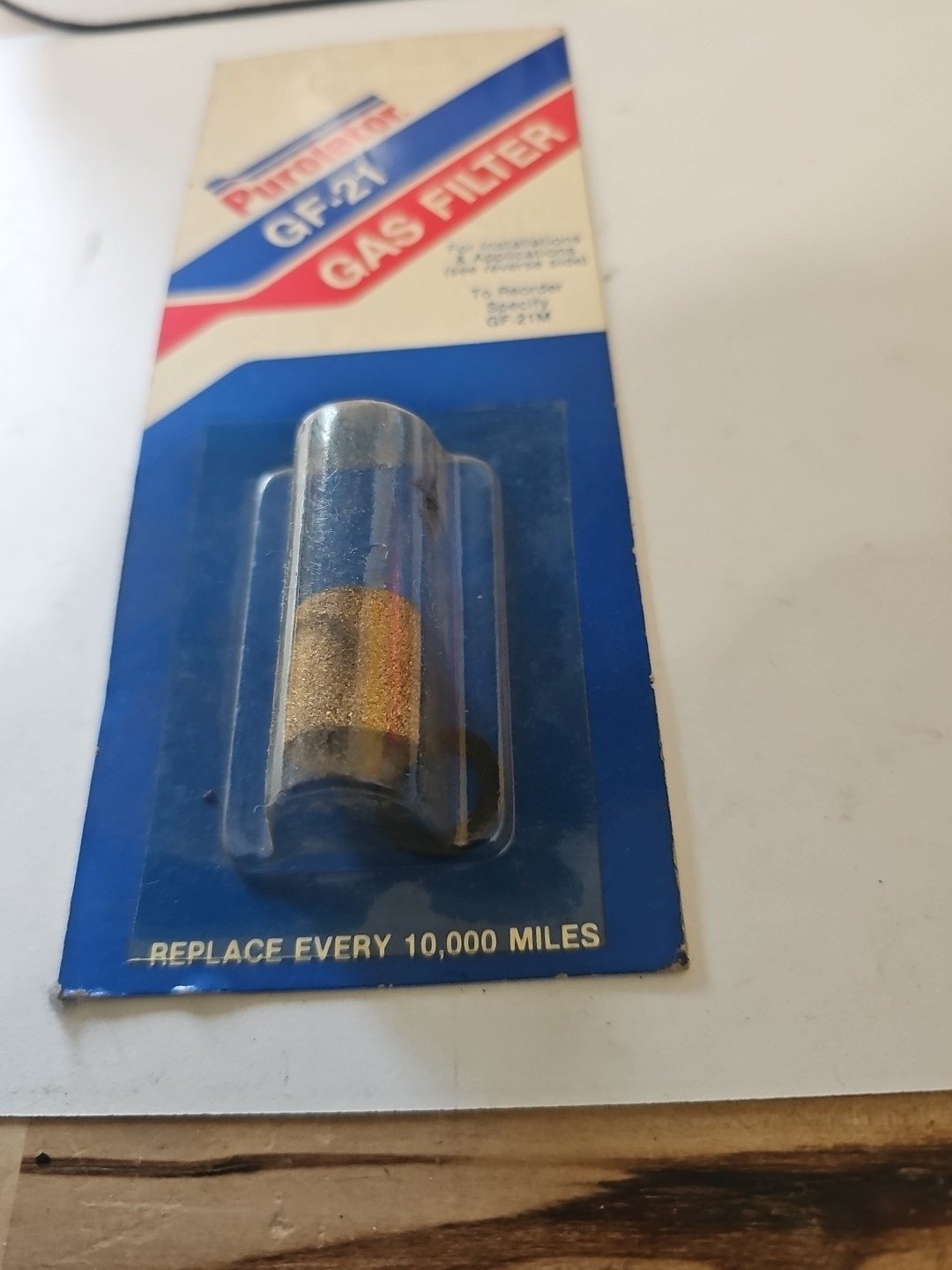 The product is a Purolator fuel filter with manufacturer part numbers GF-21, F10021, and GF-21M. This fuel filter is new old stock (NOS), meaning it is a vintage item that has never been used or installed. Purolator is a trusted brand known for producing high-quality automotive filters, including fuel filters. This particular filter is designed to effectively filter out impurities and contaminants from the fuel before it reaches the engine, ensuring optimal performance and longevity for your vehicle.