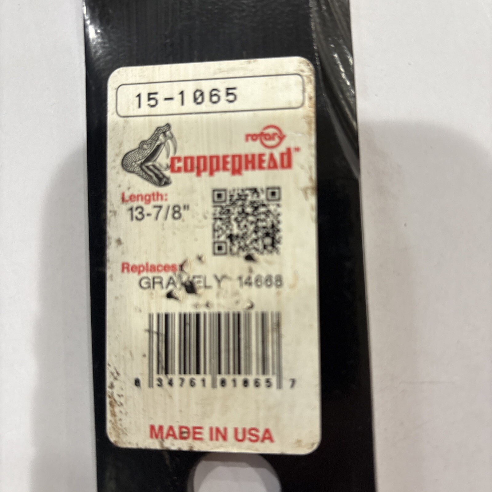 The Rotary Corp Rotary Brand (Copperhead) Replacement Blade is designed to fit Gravely model 14668. This blade measures 13-7/8" in length and 5/8" in width, making it suitable for specific cutting applications. The part number for this blade is 1065 and the interchange part number is 15-1065, ensuring compatibility with the Gravely equipment. It is a reliable replacement blade manufactured by Rotary Corp, providing quality and performance for your cutting needs.