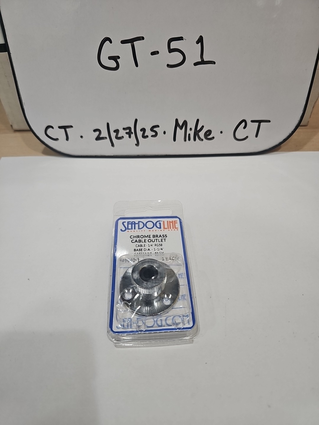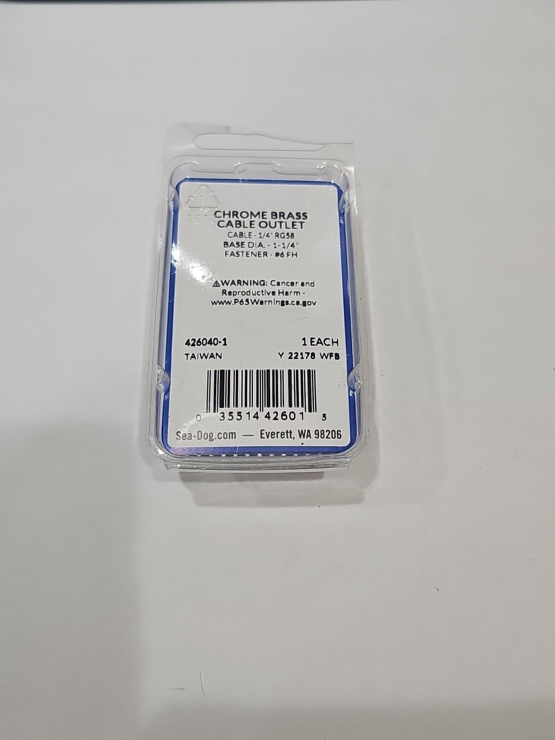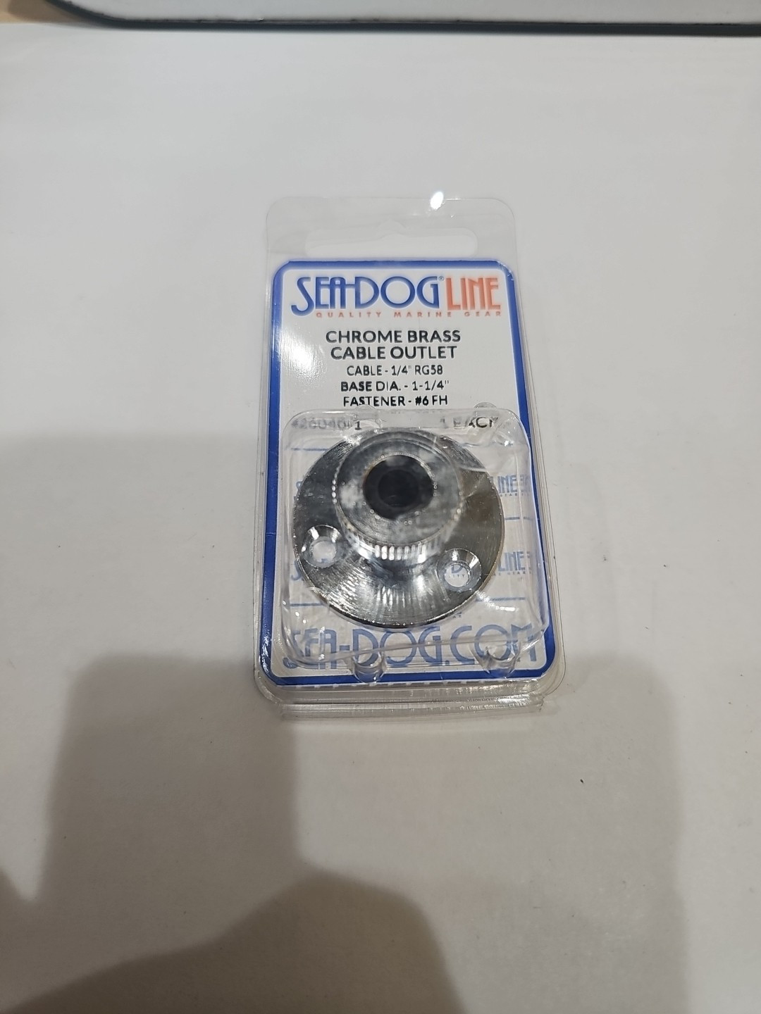 The product is a SEA-DOG LINE cable outlet made of chrome brass, designed for 1/4″ RG58 cables. The manufacturer part number for this item is 426040-1. This cable outlet is likely used for marine electronic installations, providing a secure and durable connection for RG58 cables. With its chrome brass construction, it offers both corrosion resistance and a sleek appearance for a professional installation.