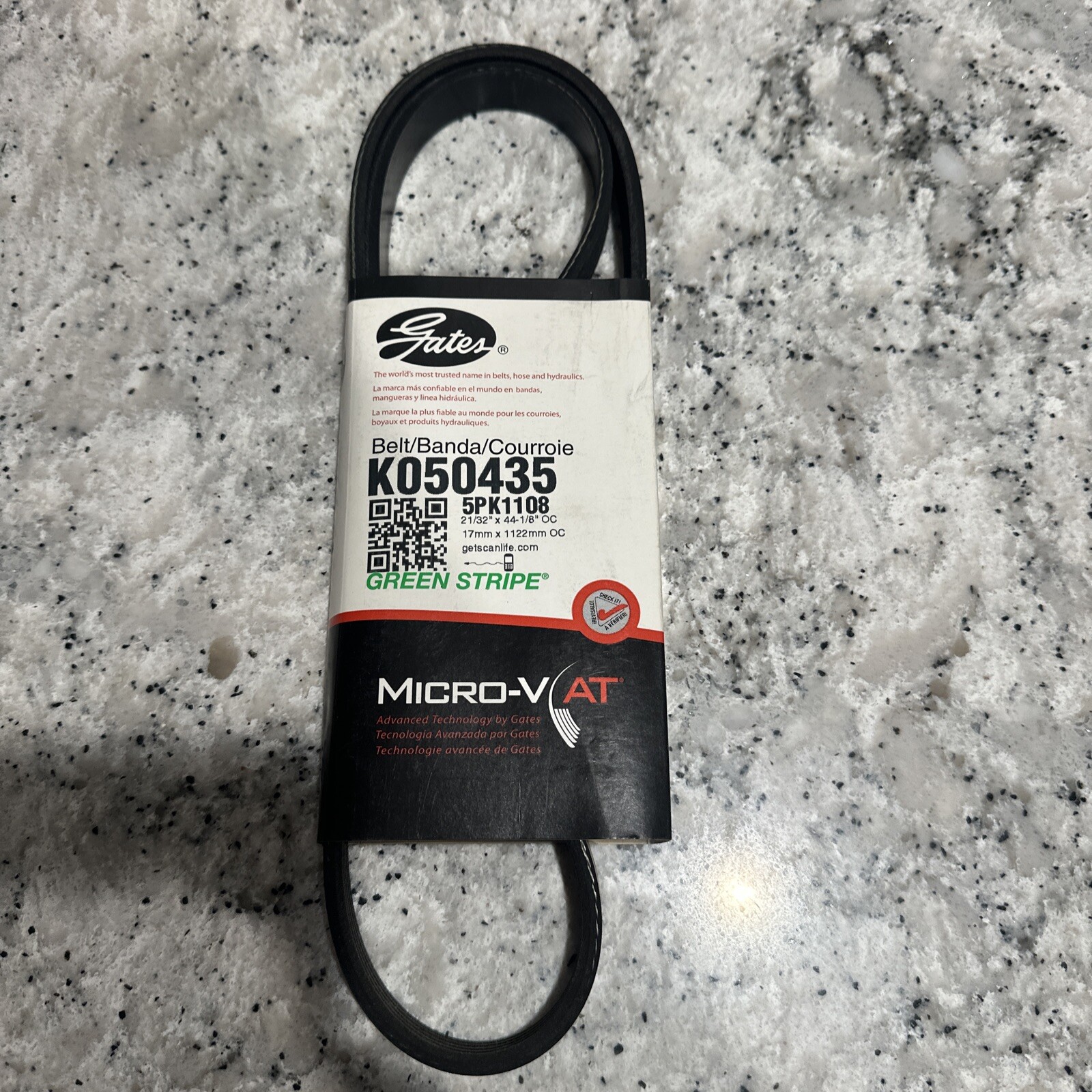 This premium OE micro-V belt from Gates is designed for high-performance and custom fitment. It features a serpentine design with five ribs and a 43.62 IN effective length, making it suitable for a variety of automotive applications. The belt is made of EPDM material and has a polyester cord, ensuring durability and reliability.