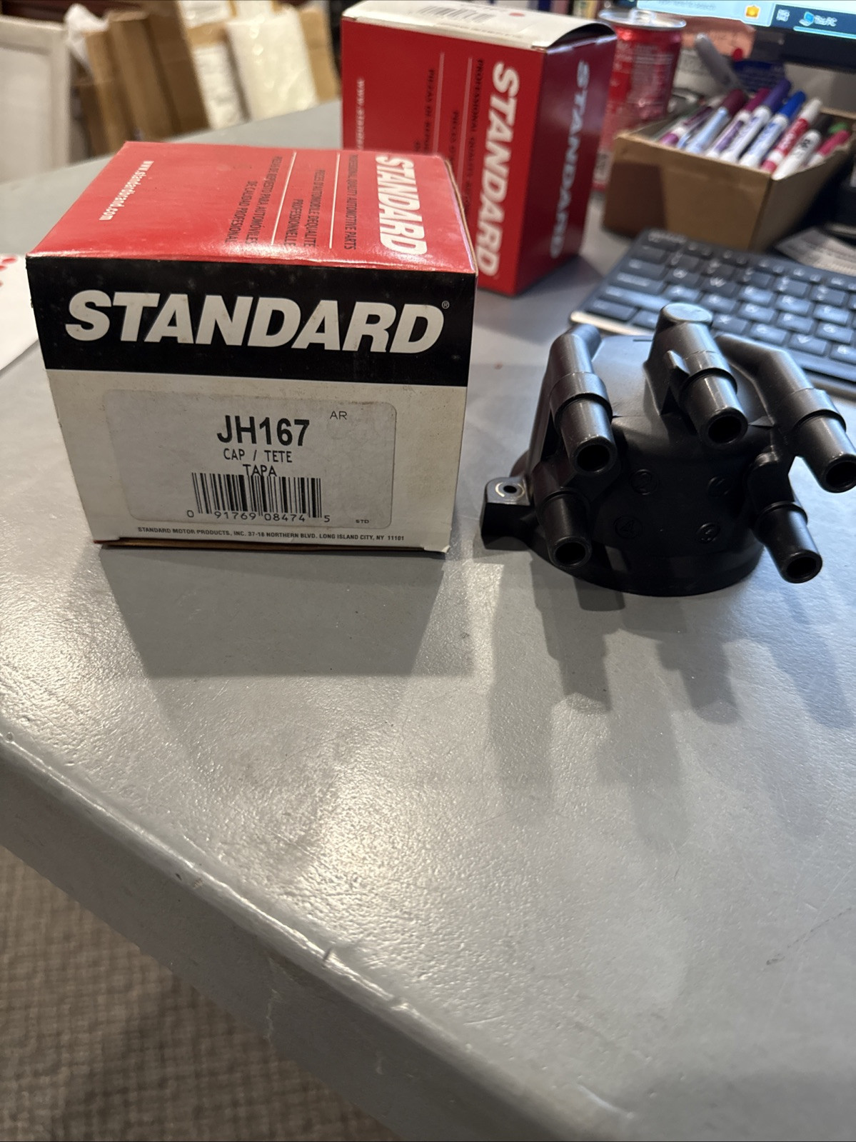 The Standard Distributor Cap, model JH167, is a new in box component designed for ignition systems in vehicles. Made in the United States, this black distributor cap comes with the necessary hardware for installation. With an OE/OEM Part Number of JH167 and Manufacturer Part Number of JH167, this distributor cap is a reliable choice for maintaining the proper functioning of your vehicle's ignition system.