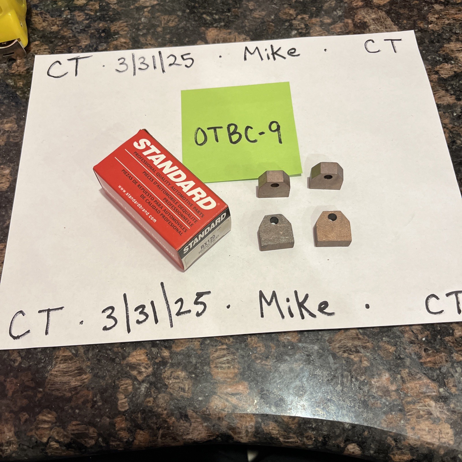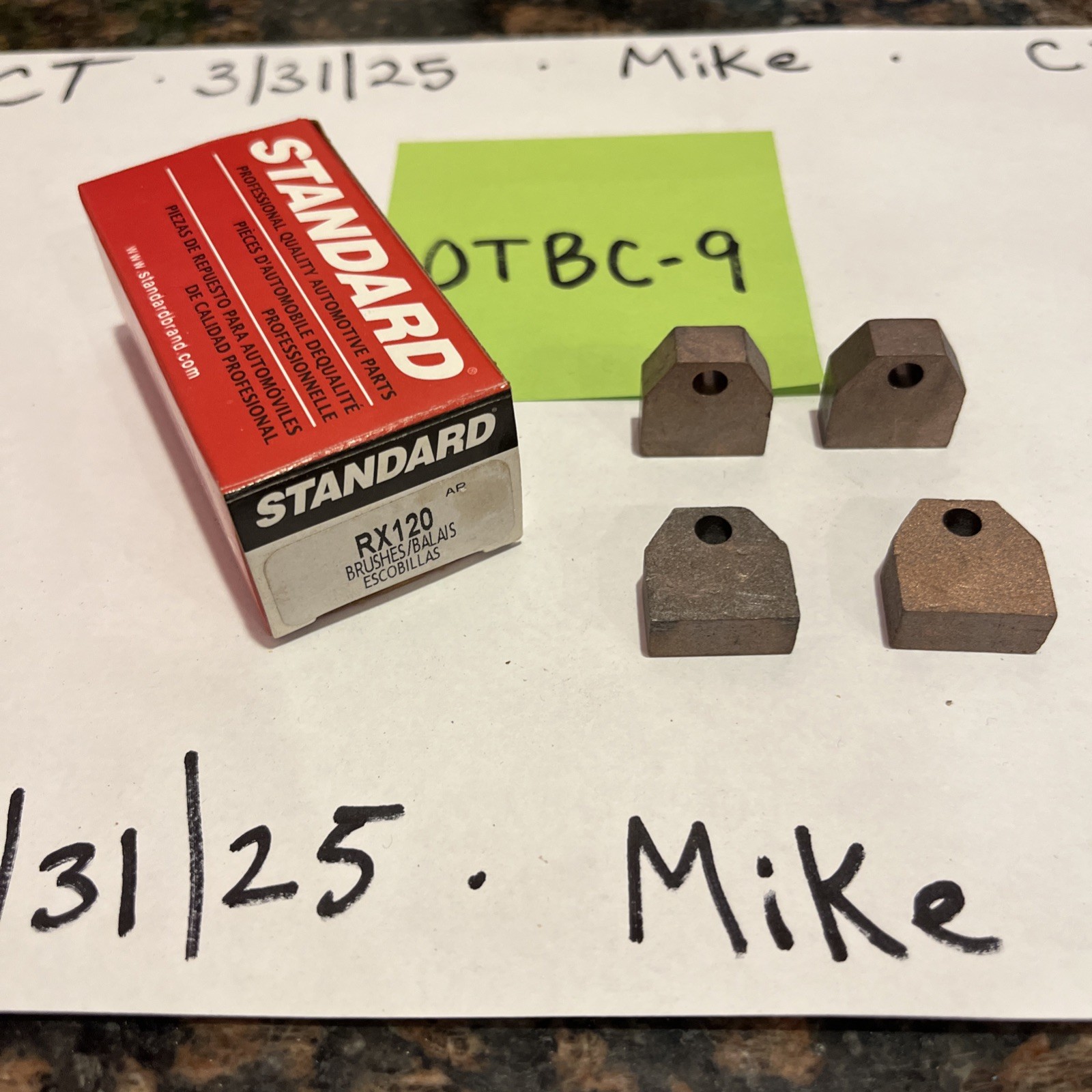 The product is a starter brush set with the brand name of Standard Ignition and the manufacturer part number of RX-120. It has a brushed finish and is interchangeable with several other part numbers such as X322, IGNA84, RS120, RX132, 1852890, R509, D764, and 1852880. The product is designed for use in car and truck starter motors and is a component of the starter motor parts.
