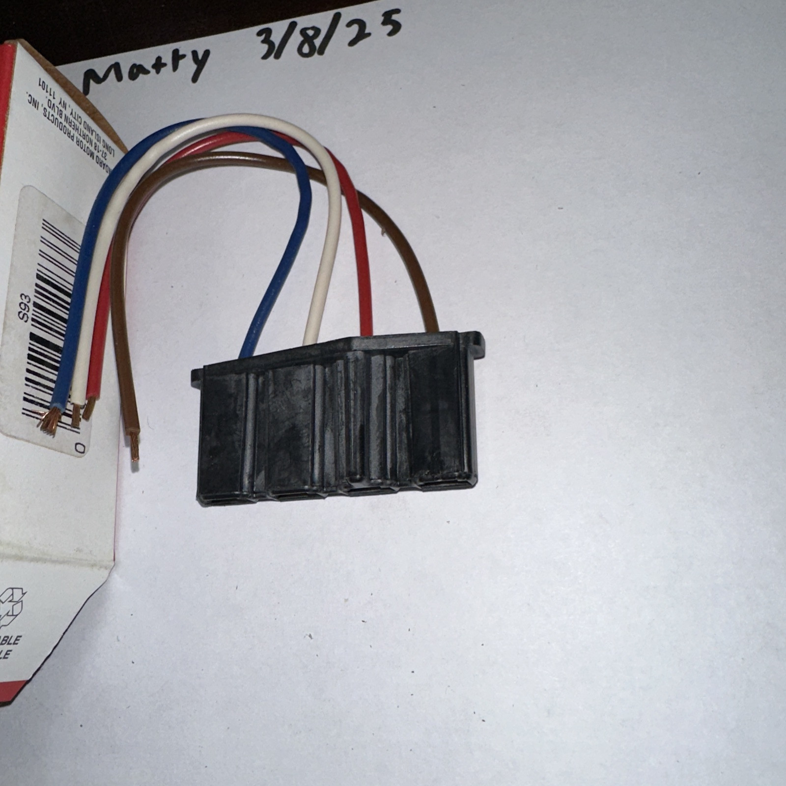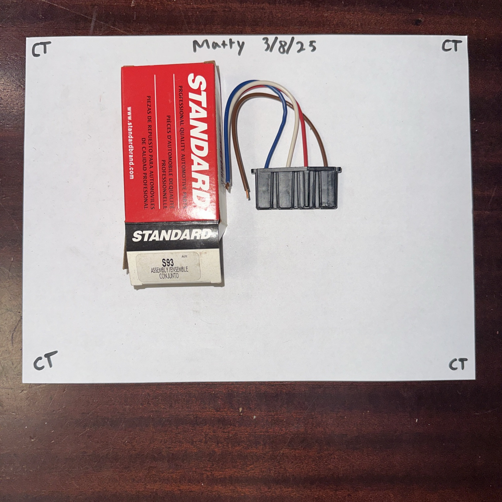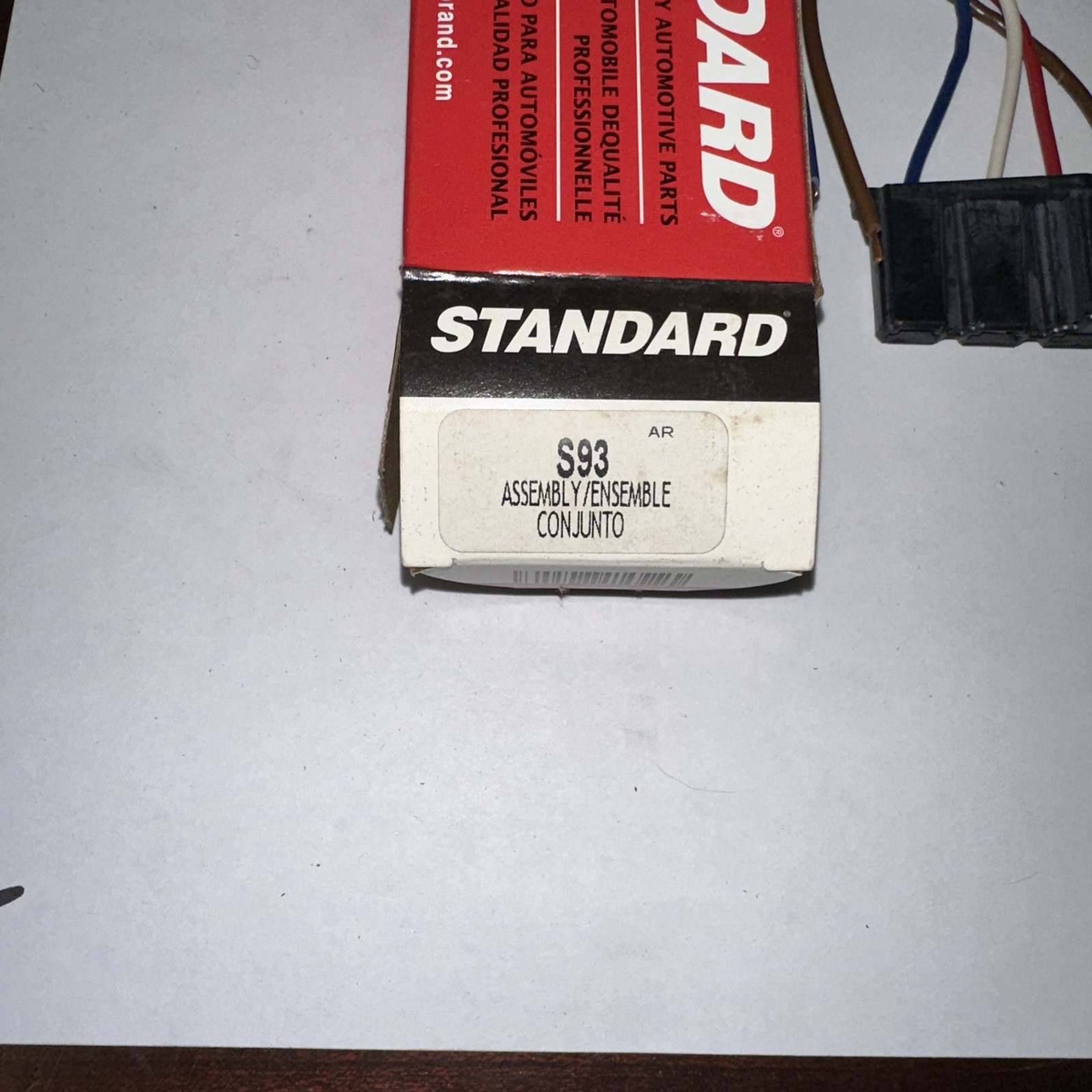 The product is a Connector Assy. Part S93 manufactured by Standard Motor Products. It is designed for use in automotive starters, alternators, ECUs, and wiring systems. The item is depicted in the accompanying picture for reference.