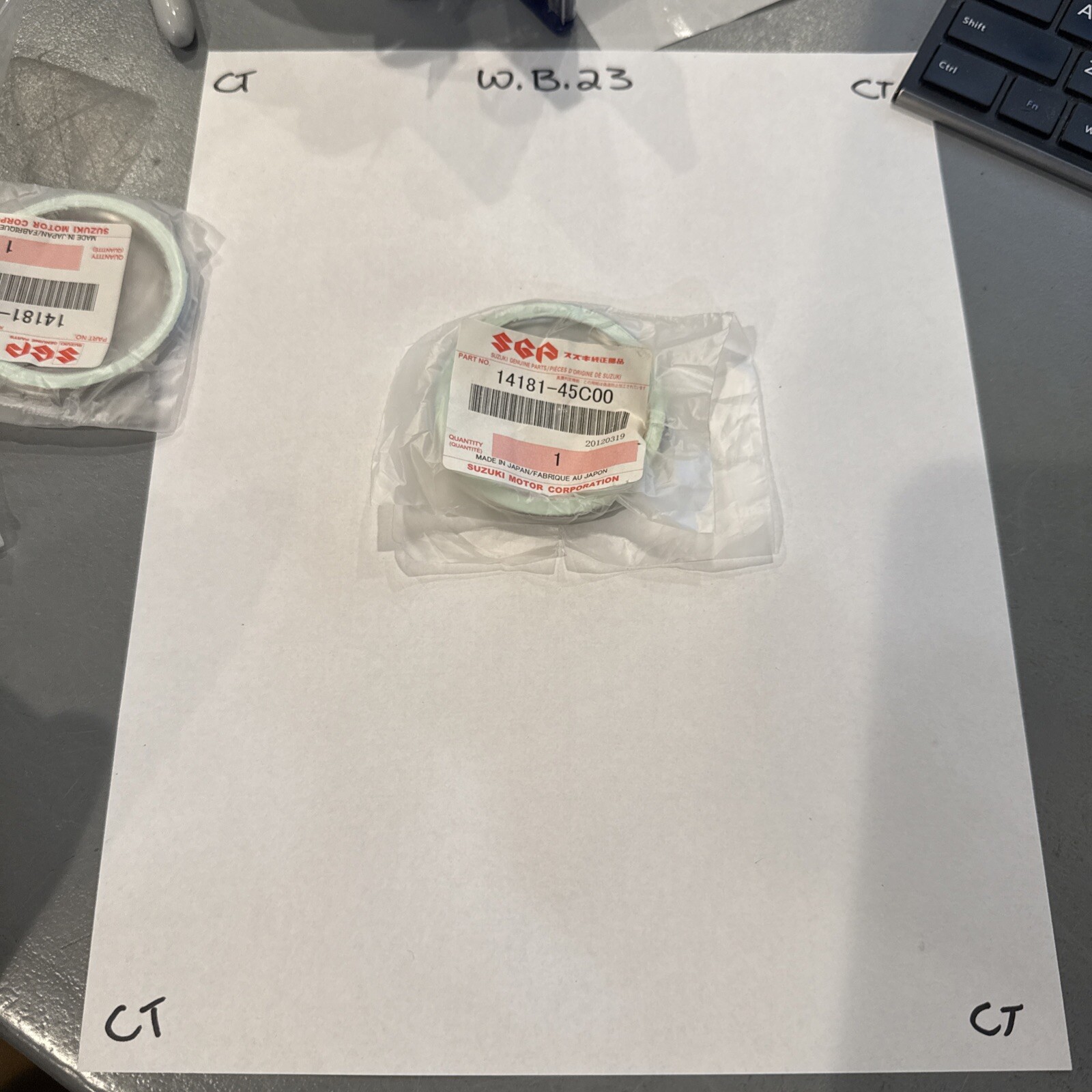 The product is a Suzuki OEM exhaust gasket with the manufacturer part number 14181-45C00. This gasket is designed for use in Suzuki ATVs, side-by-sides, and UTVs, providing a reliable seal for the exhaust system. It is a new, genuine Suzuki part, ensuring a proper fit and high-quality performance in maintaining the exhaust system's integrity.