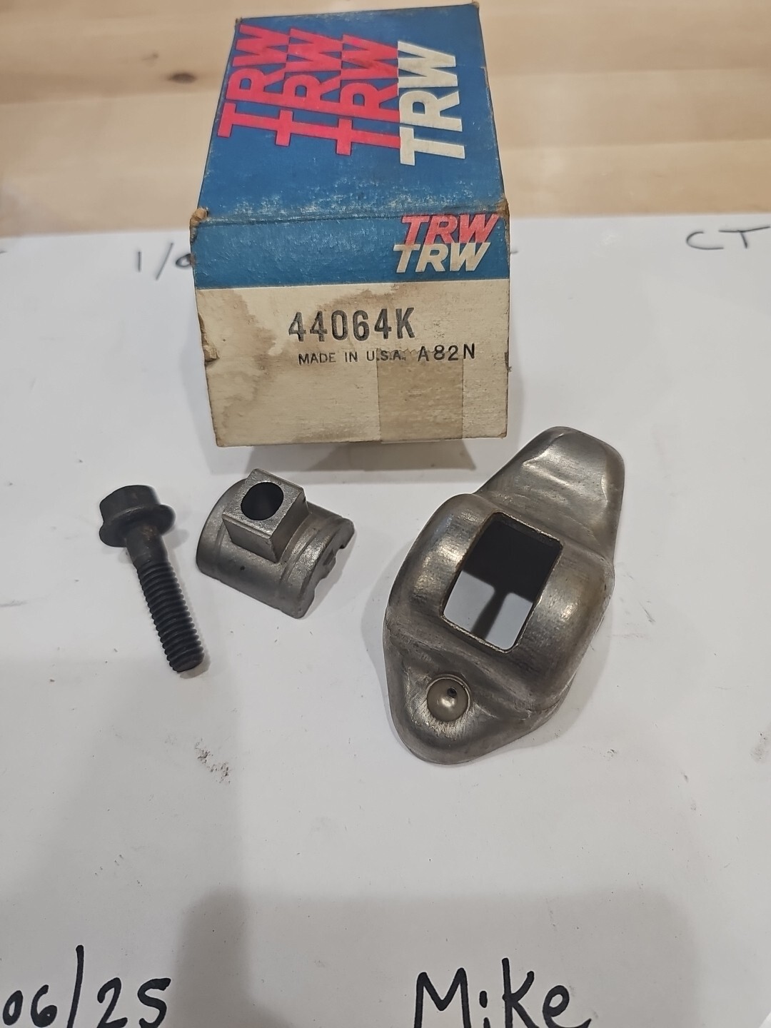This is a TRW Vintage Rocker Arm Kit for Ford vehicles. The kit includes parts with interchange, OE/OEM, manufacturer, and superseded part numbers 44064K, R-1046, 181-1034, 214-1078. It is a vintage part made in the United States.