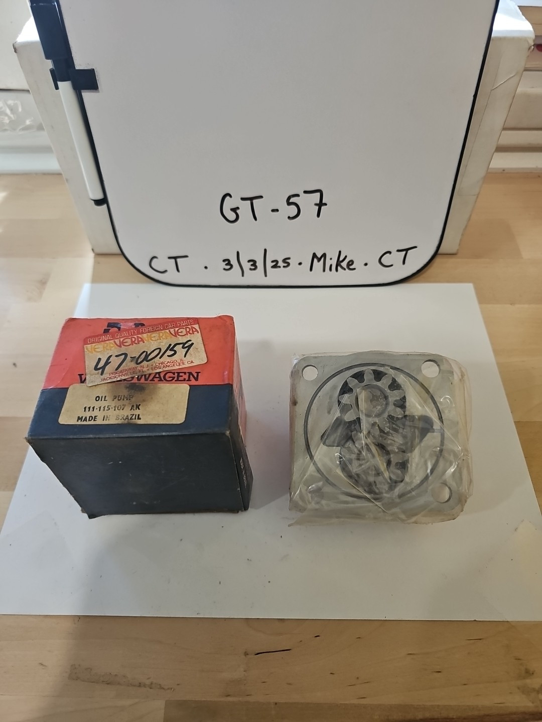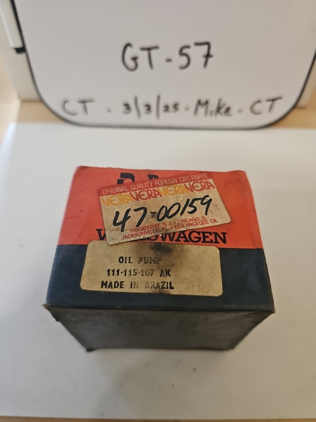 This is a vintage Resolit oil pump with part number 111-115-107AK, 47-00159. It is a NOS (new old stock) item for VW, possibly from the 1950s or 60s. The pump is designed to be used in Volkswagen engines and is compatible with a variety of VW models.