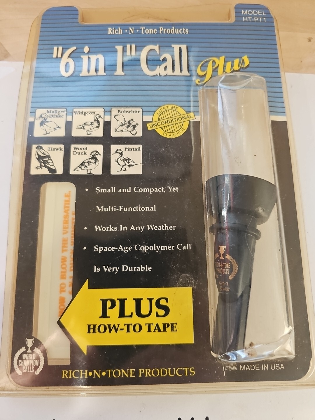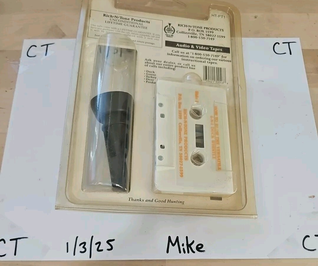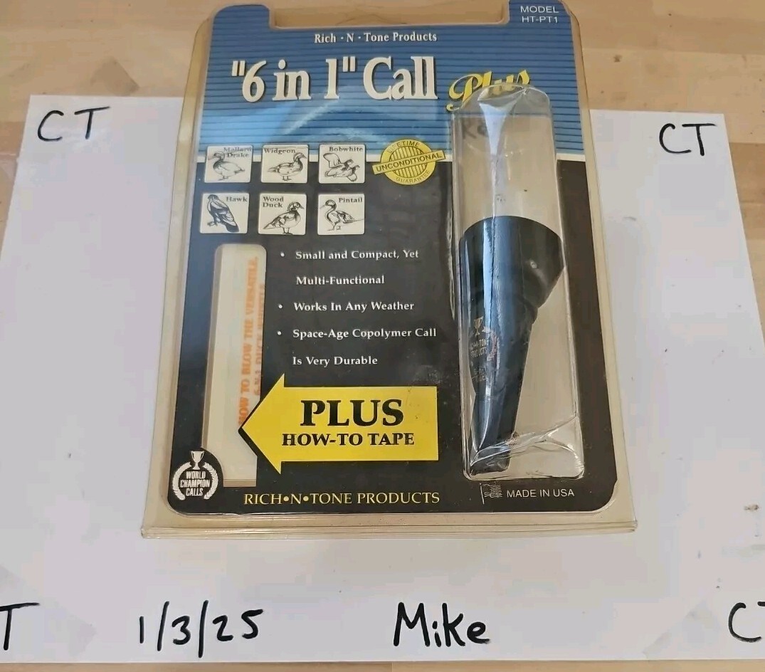 The product is a vintage Rich-N-Tone 6-N-1 duck call with a duck whistle and cassette. It is made by Rich-N-Tone Products and is black in color. This call is designed for duck hunting and is a versatile 6-in-1 call that includes a duck whistle.